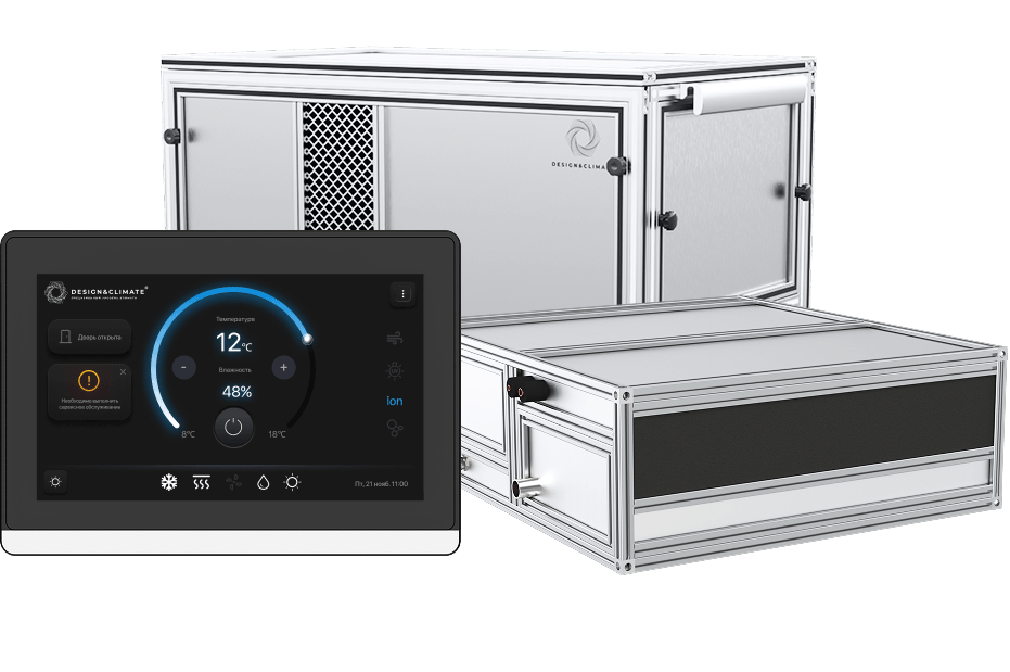 На базе контроллера EVCO (Италия) собственное программное обеспечение поддерживает оптимальные параметры температуры и влажности независимо от окружающей среды